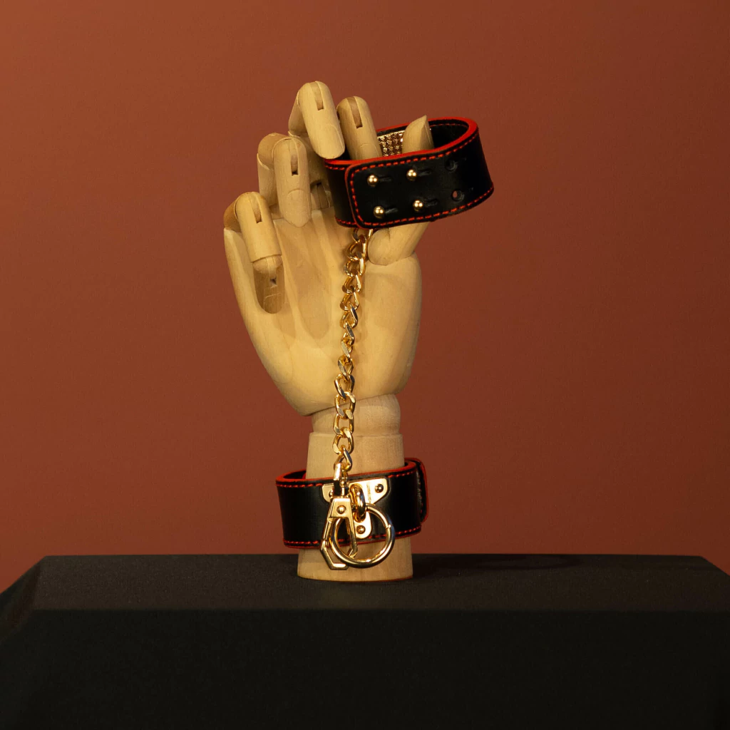 O ajuste é feito por uma fivela e as mãos ficam separadas por uma corrente metálica dourada.