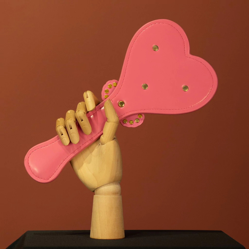 Chibata palmatória de couro sintético almofadado em formato de coração. Lindíssima, enfeitada com pedrinhas brilhantes e um lacinho.